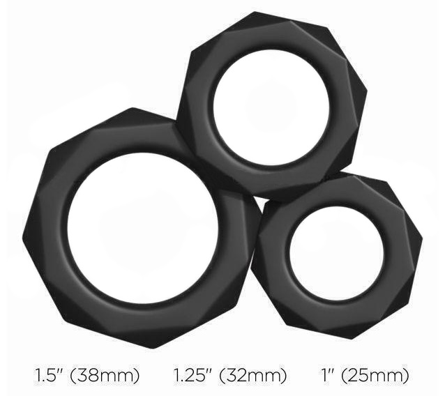Вся прелесть такого набора в том, что Вы можете носить сразу два или три колечка: одно из которых может быть у основания пениса, а другое под мошонкой.
