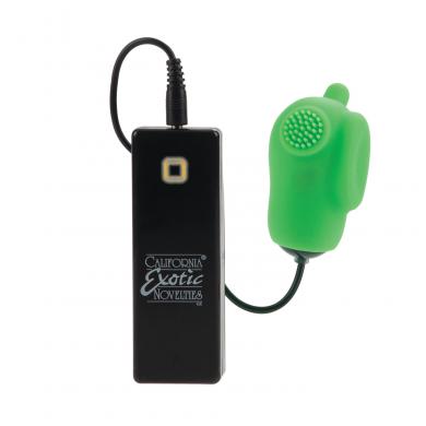 Есть кнопка быстрого выключения. Вибро-яичко можно использовать отдельно, а можно вместе с мягкой силиконовой насадкой салатового цвета. Насадка с тремя типами стимуляторов - мягкая щеточка, ложбинка и упругий шип.