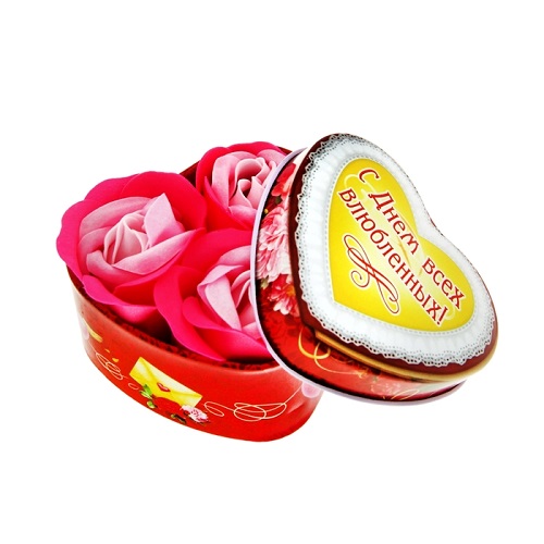 Три бутона мыльных лепестков двух оттенков преподносятся в аккуратной металлической коробке-сердце с уникальным дизайном.
