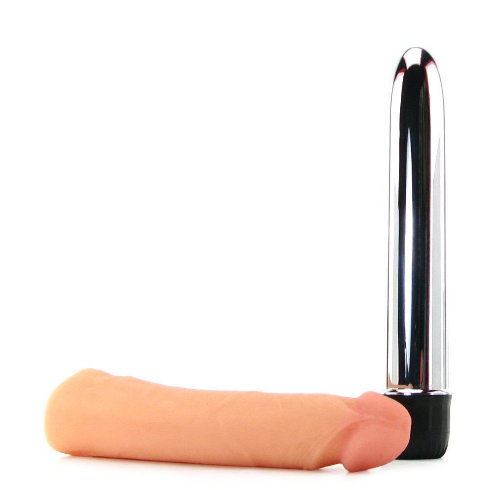 Серебряный пластиковый вибратор-жезл хорош сам по себе, но в комплекте с реалистичной насадкой из киберскина он просто восхитителен!