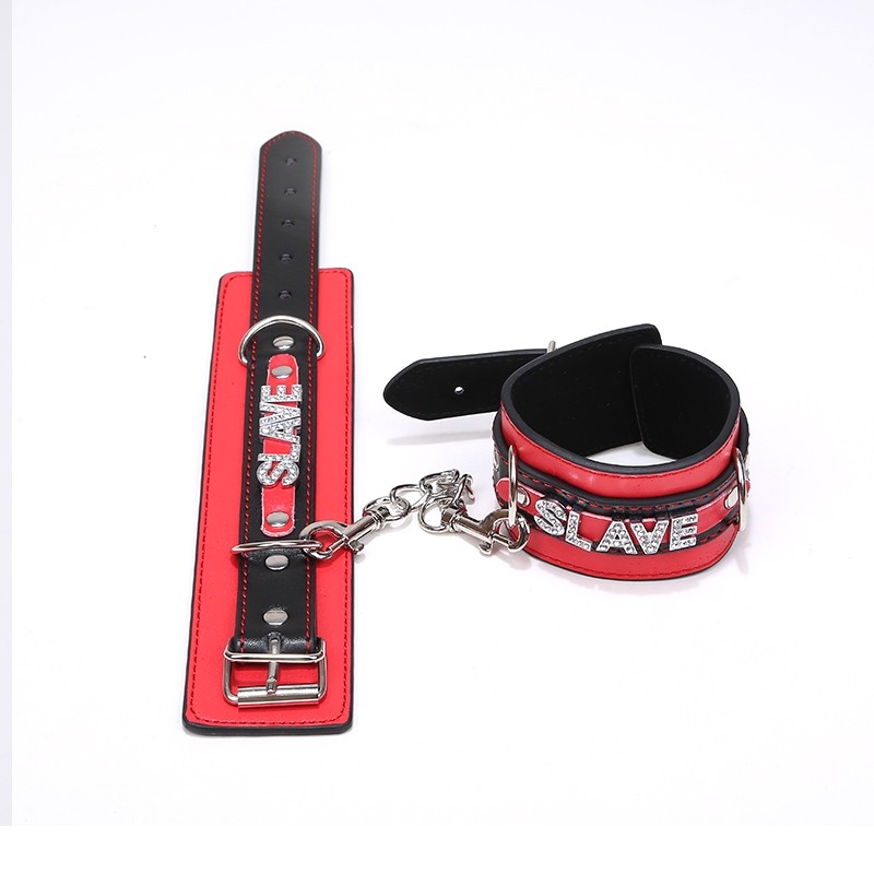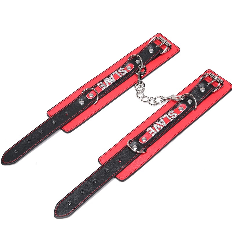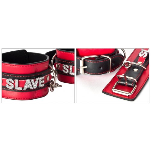 Стильные наручники украшены молдингами в виде надписи Slave, инкрустированными кристаллами.