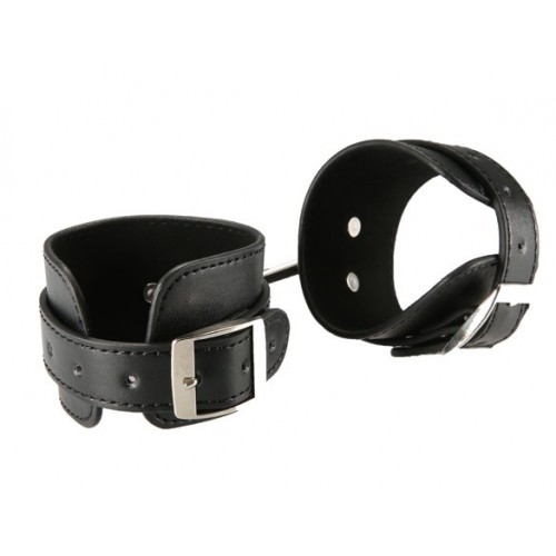 Лицевая часть оков декорирована металлическими клепками. Имеются удобные регулируемые ремешки, способные создать полную фиксацию рук. Между собой наручники соединены короткой цепью, состоящей из 3 звеньев и 2 карабинов.