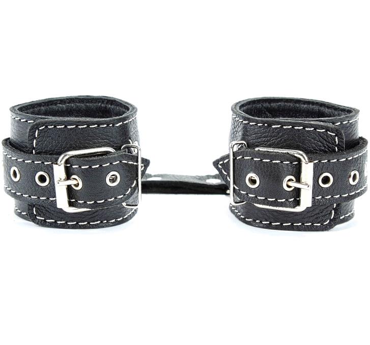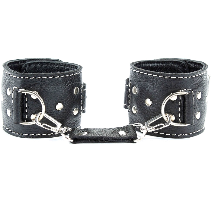 Металлическая фурнитура крепко удерживает в подчинении. Кожаное соединение на карабинах фиксирует наручники вместе.