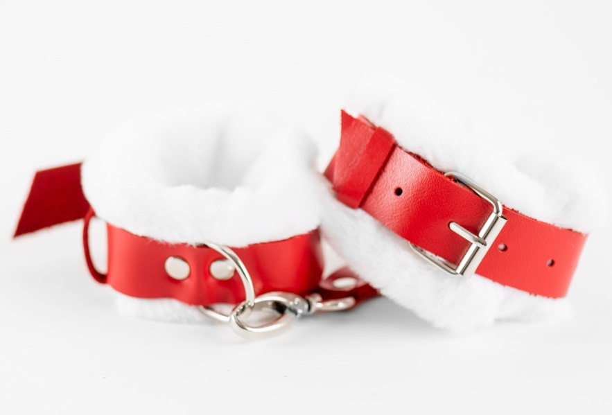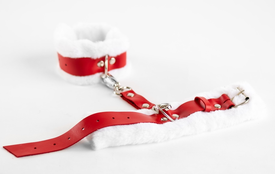 Наручники выполнены из натуральной красной кожи с мягким белым мехом.