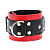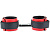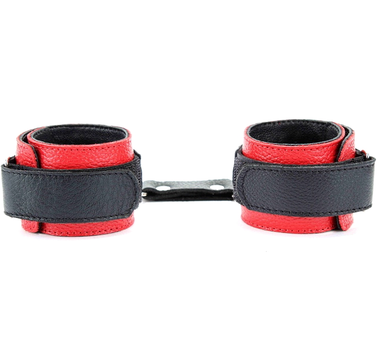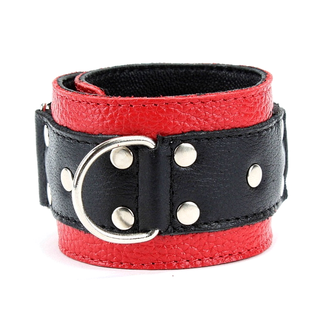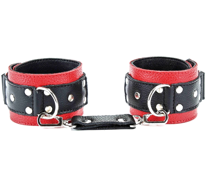 Классические наручники на липучке, декорированные заклепками и выполненные из натуральной мягкой кожи черного и красного цветов.