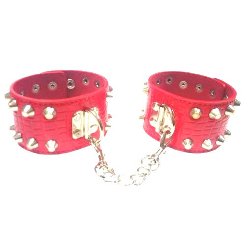 Регулируется по размеру с помощью металлических кнопок. Так же наручники декорированы шипами с гладкими углами, что не позволит получить какой-либо дискомфорт в ходе их использования. Цепочка на карабинах скрепляет два наручника между собой.