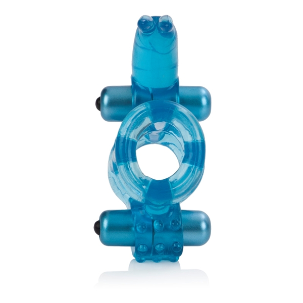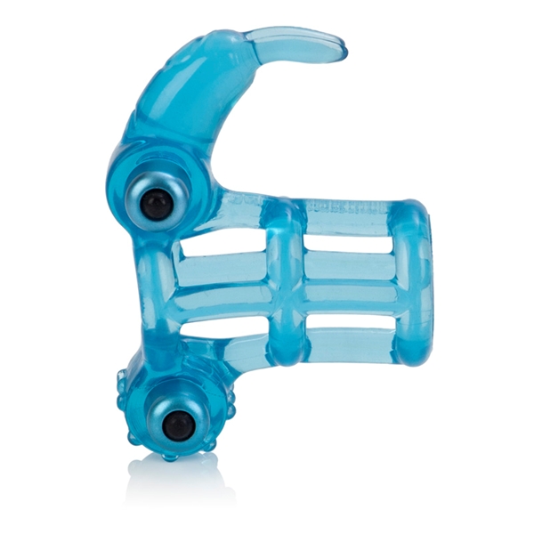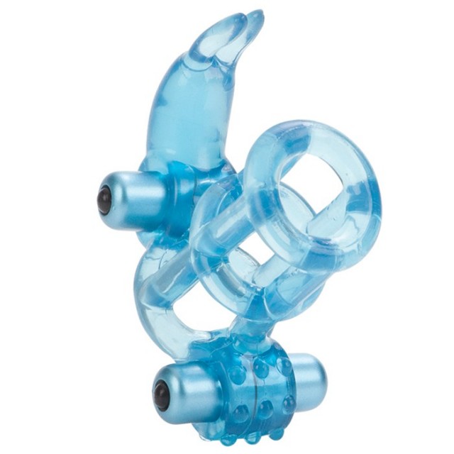 Насадка помогает продлить состояние эрекции полового члена, один вибро-элемент предназначен для стимуляции мошонки, а второй для массажа клитора с помощью ушек кролика.