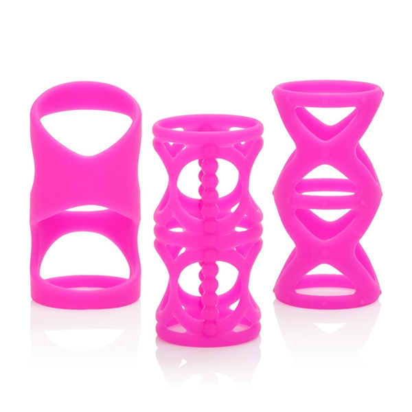 Комплект насадок для пениса из яркого розового силикона с разным рельефом. Насадка одевается на эрегированный пенис и своим рельефом просто сводит с ума обоих партнеров, добавляя новые ощущения при привычном сексе.