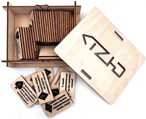 Игра состоит из 36 деревянных карточек, на каждой из которых написаны дерзкие и интересные вопросы на тему 18+ и более нейтральные, в которых учтены различные аспекты человеческих отношений, стиля жизни и развлечений.