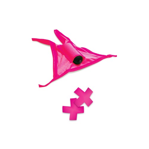 Эротический неоновый комплект, в который входят сексуальные трусики-стринги с вырезом в области вагины, пэстисы на соски и вибропуля!