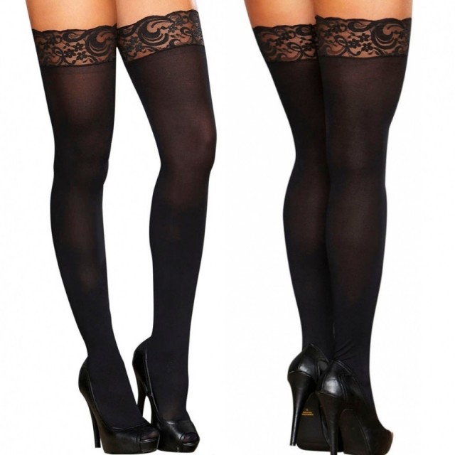 Черные гладкие чулочки с широкой кружевной резинкой сделают Ваши ножки еще стройнее, длиннее и сексуальней.
