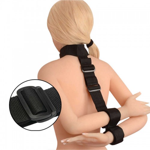 От ошейника по спине идет длинный регулируемый ремень с наручниками.