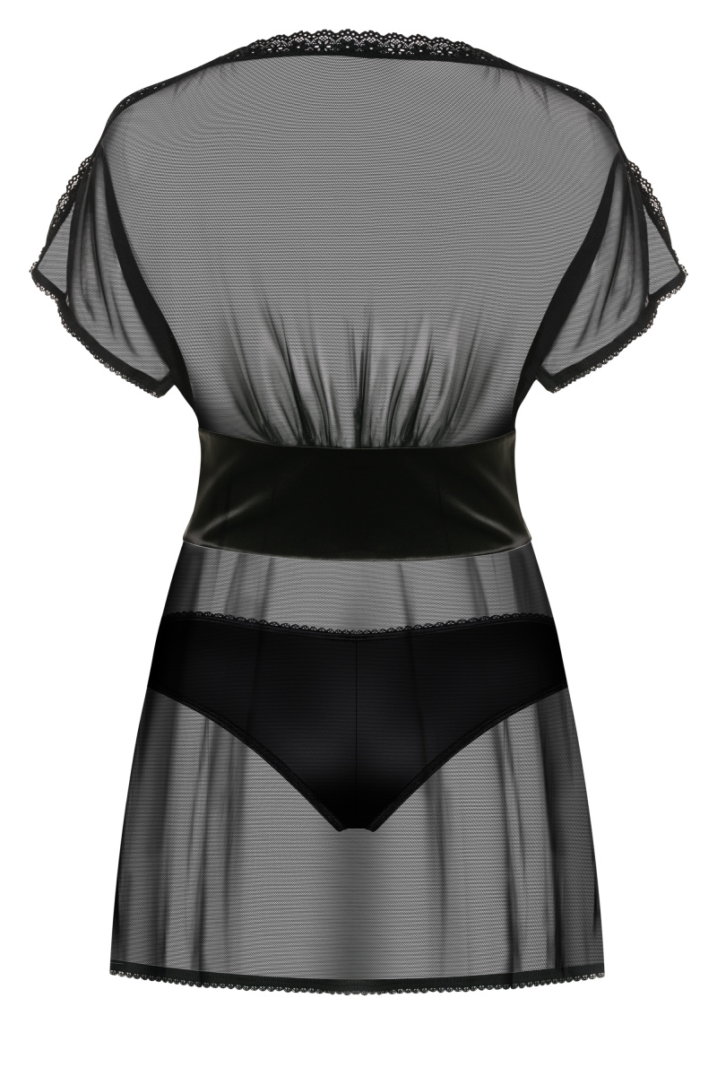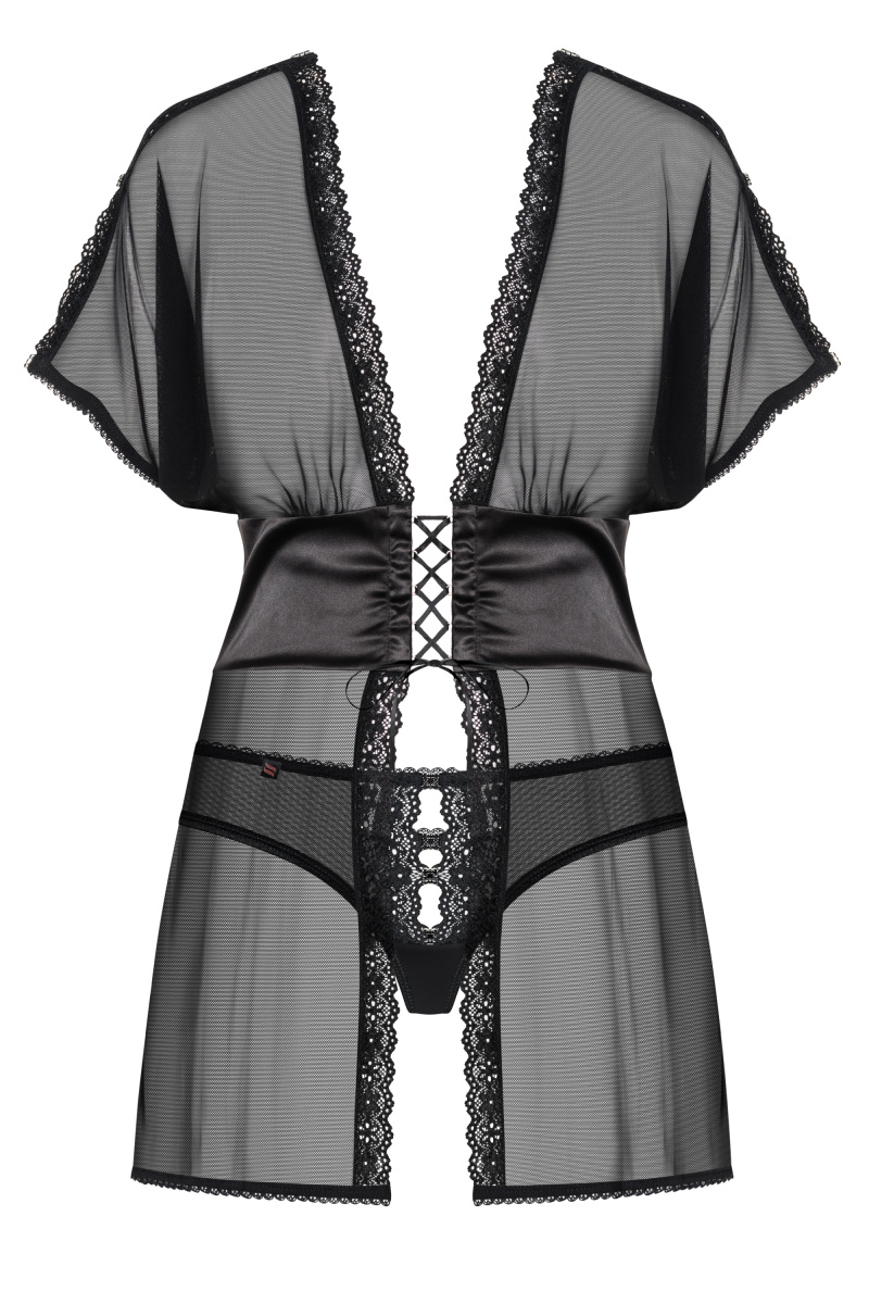 Детали: уникальный воздушный беби-долл из прозрачной сетки, разрезы на рукавах кокетливо приоткрывают плечи, элегантное украшение в виде фианитов черного цвета - шесть тонких вставок на плечах, регулируемая шнуровка под грудью - сексуальный мотив, идеальная посадка, полоска из атласного материала красиво соединяет верх и низ сорочки, края бэби-долла декорированы кружевом, интригующие разрезы на бедрах, приятная на ощупь эластичная ткань.