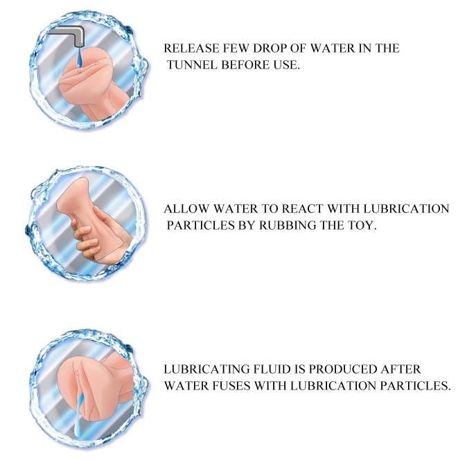 Особенность игрушки заключается в том, что при добавлении нескольких капель воды в тоннель мастурбатора, материал принимает консистенцию скользящей, увлажняющей смазки.