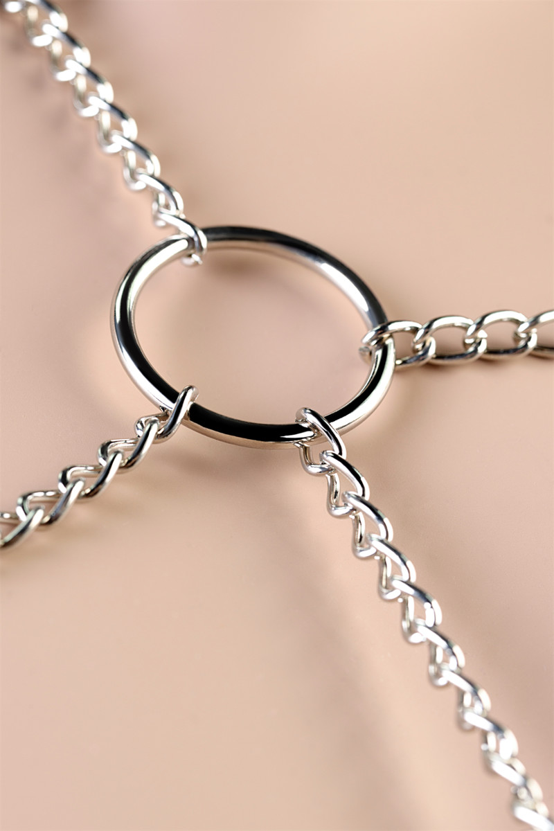 Трусики-стринги фантазийной формы украшены сверкающими цепочками, эффектное бра