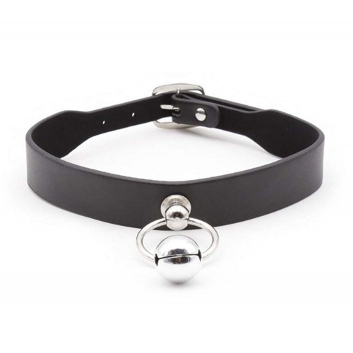 Оригинальный черный ошейник, декорированный колокольчиком, имеет крепление в виде застежки.