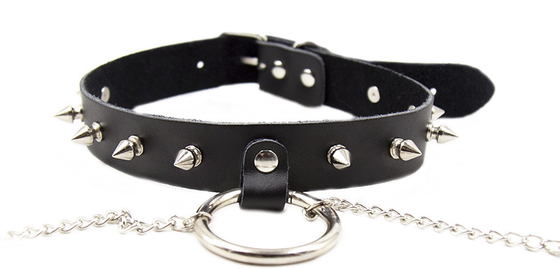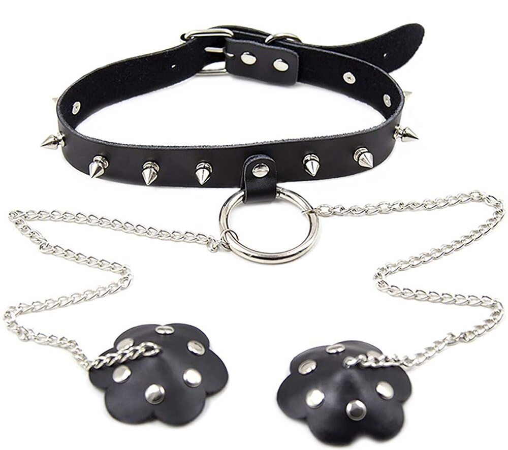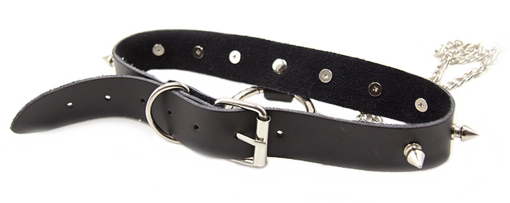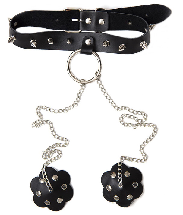 Ошейник украшен серебристыми металлическими шипами, так же от него отходят 2 цепочки, к которым крепятся зажимы для сосков.