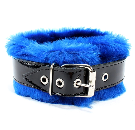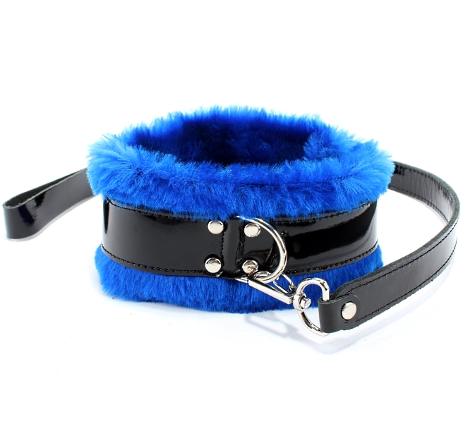 Ошейник выполнен из натуральной лакированной кожи черного цвета. Подклад выполнен из мягкого эко-меха ярко-синего цвета.