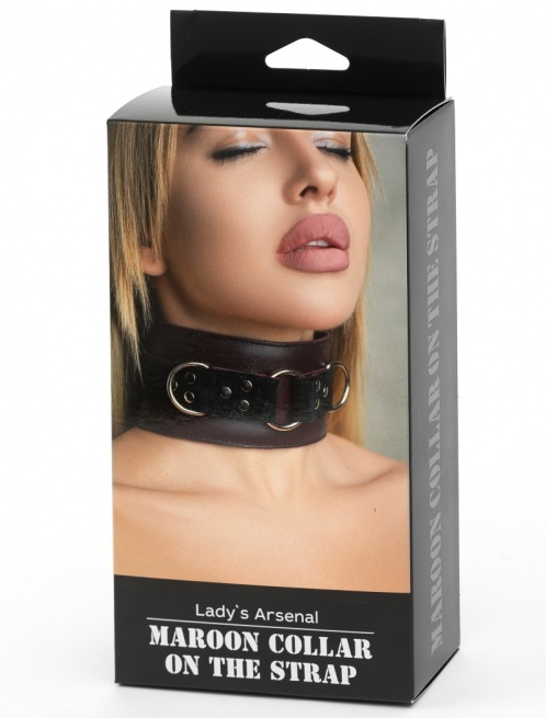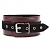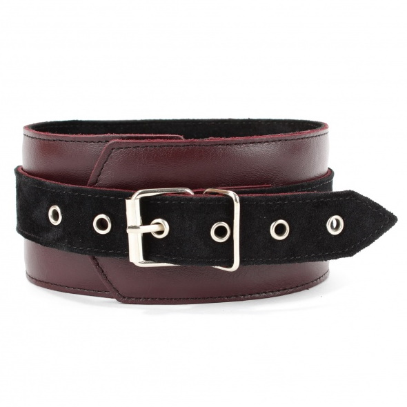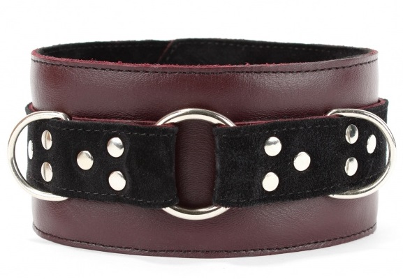 Ошейник выполнен из натуральной кожи бордового цвета, декорирован вставкой из черной замши, заклепками, металлическим кольцом и двумя полукольцами.