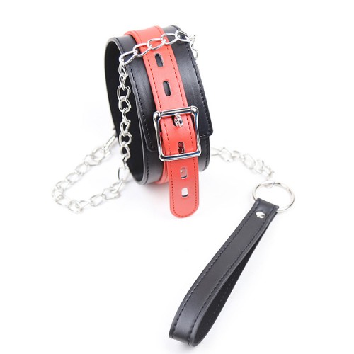 Ошейник выполнен из черной искусственной кожи и красиво украшен вставками из красной искусственной кожи.