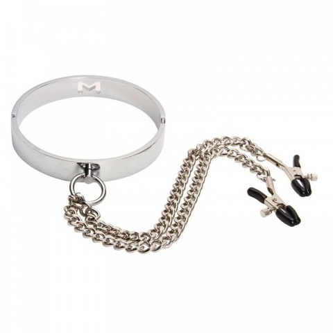 На ошейнике металлическое кольцо, от которого идут зажимы на соски. Кольцо это, при желании, можно легко открутить.