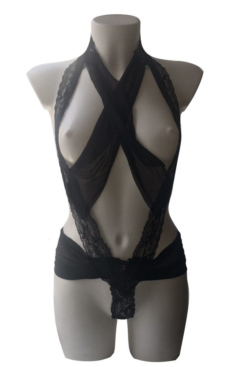 Восхитительное черное боди с глубоким вырезом украшено нежным цветочным кружевом. Необычный крой отрывает грудь, привлекая внимание.