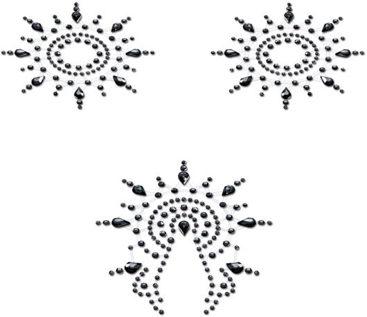 В комплект входят 2 наклейки на соски и 1 наклейка на лобок из множества кристаллов,