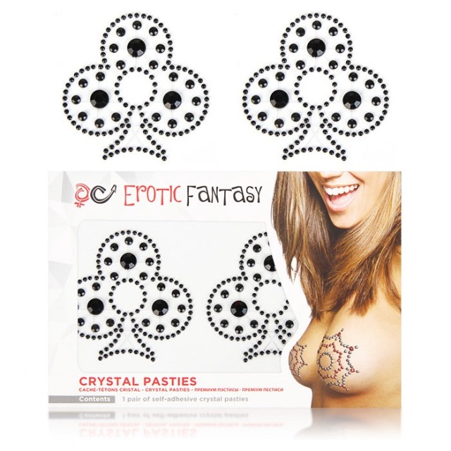 Пэстисы-наклейки на грудь из черных переливающихся кристаллов, выложенных в форме карточной масти треф.