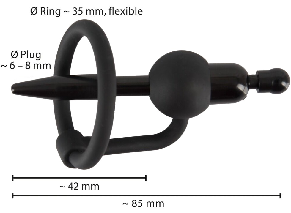 Penis Plug осторожно вставляется в уретру, а эластичное силиконовое кольцо помещается за головку, так оно надежно закрепляет положение плага и предотвращает выскальзывание.