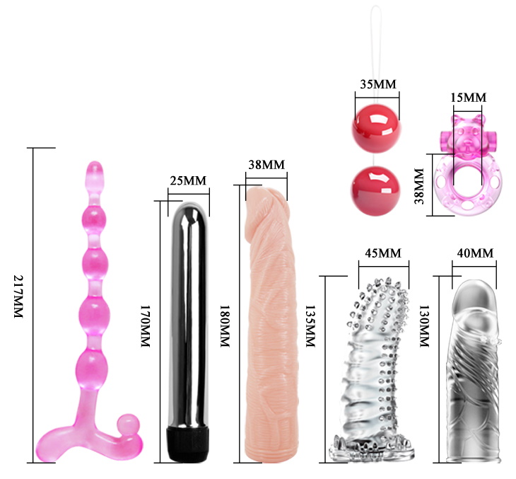 Размеры: анальная елочка - общая длина 21,7 см; вибростимулятор - общая длина 17 см, диаметр 2,5 см; насадка - общая длина 18 см, диаметр 3,8 см; насадка с пупырышками - общая длина 13,5 см, диаметр 4,5 см; насадка с венками - общая длина 13 см, диаметр 4 см, вагинальные шарики - диаметр 3,5 см; эрекционное кольцо - длина 3,8 см, диаметр клиторального отростка 1,5 см
