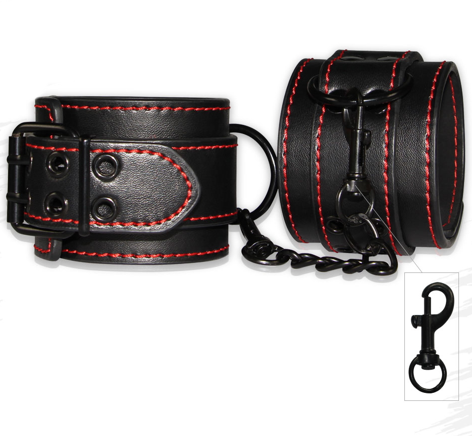 Фиксаторы прочно будут сковывать движения Вашего партнера, но всегда можно легко и быстро освободить его. Поножи соединены между собой цепочкой с карабинами, которые легко и быстро отстегиваются.