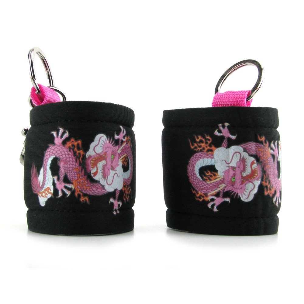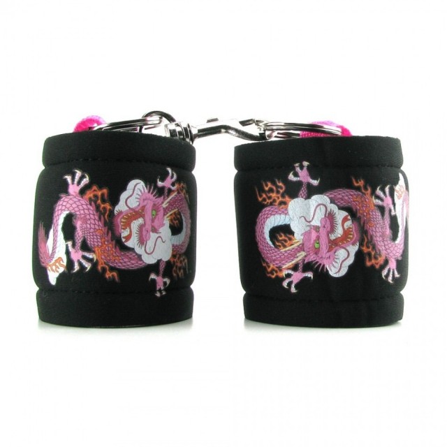Мягкие поролоновые наручники с принтом татуировки в виде дракона. Размер наручников легко регулируется при помощи ленты-липучки, а удобные кольца с карабином позволят их использовать в различных позициях.