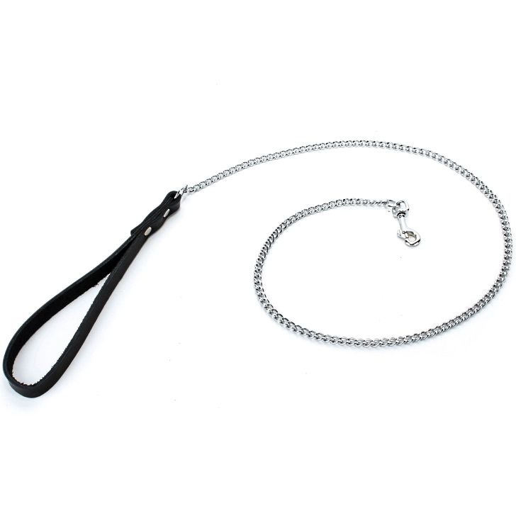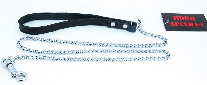 Стильный поводок из ручки черного цвета, выполненной из натуральной кожи, и металлической цепи с никелевым покрытием.