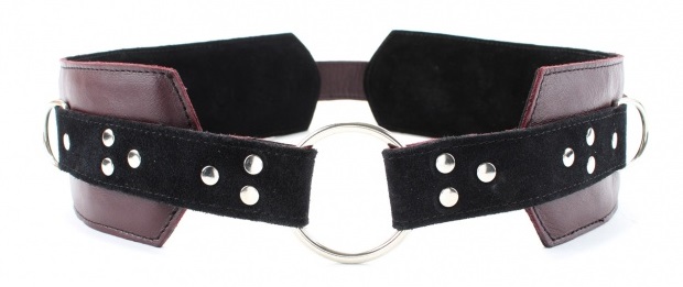 Пояс выполнен из натуральной кожи бордового цвета, декорирован ремнями из черной замши, тремя металлическими кольцами и четырьмя полукольцами.