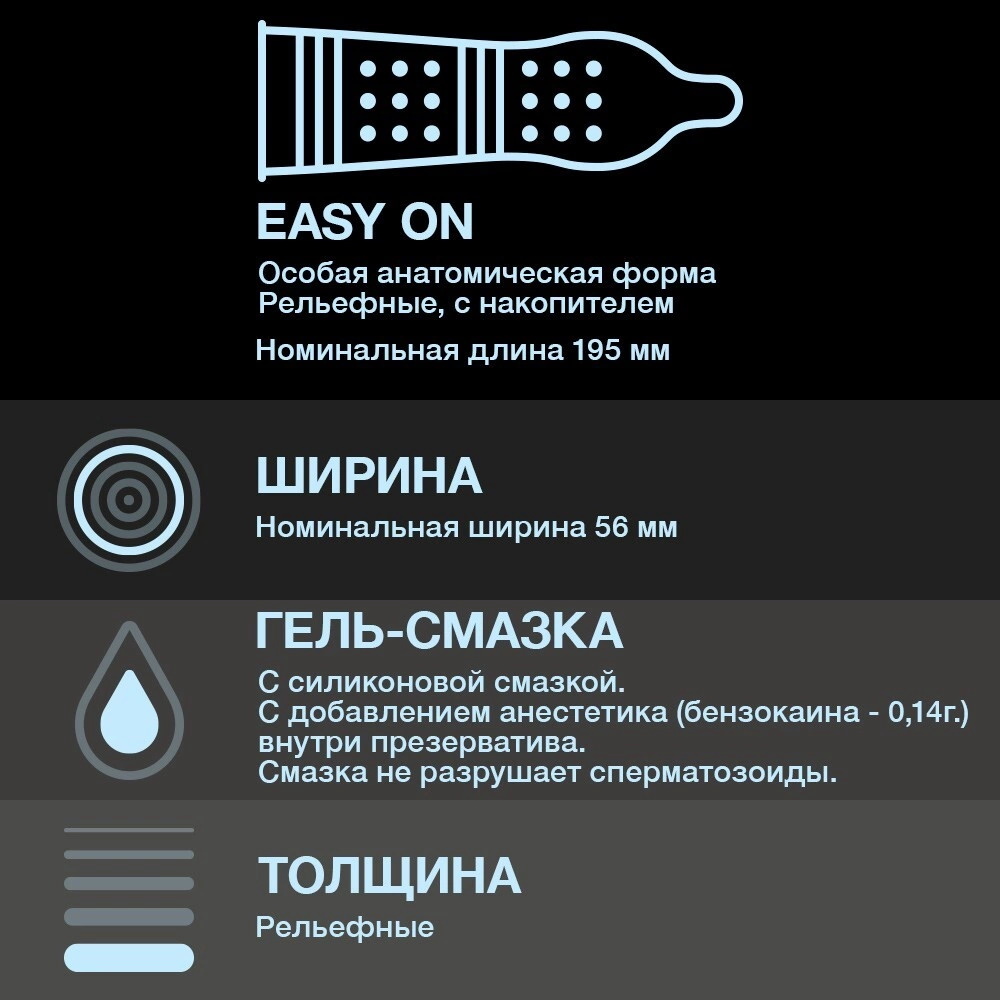 Анестетик (бензокаин) внутри данных презервативов может продлить половой акт мужчины, а ребра и пупырышки на поверхности презерватива могут усилить стимуляцию и ускорить наступление оргазма женщины.