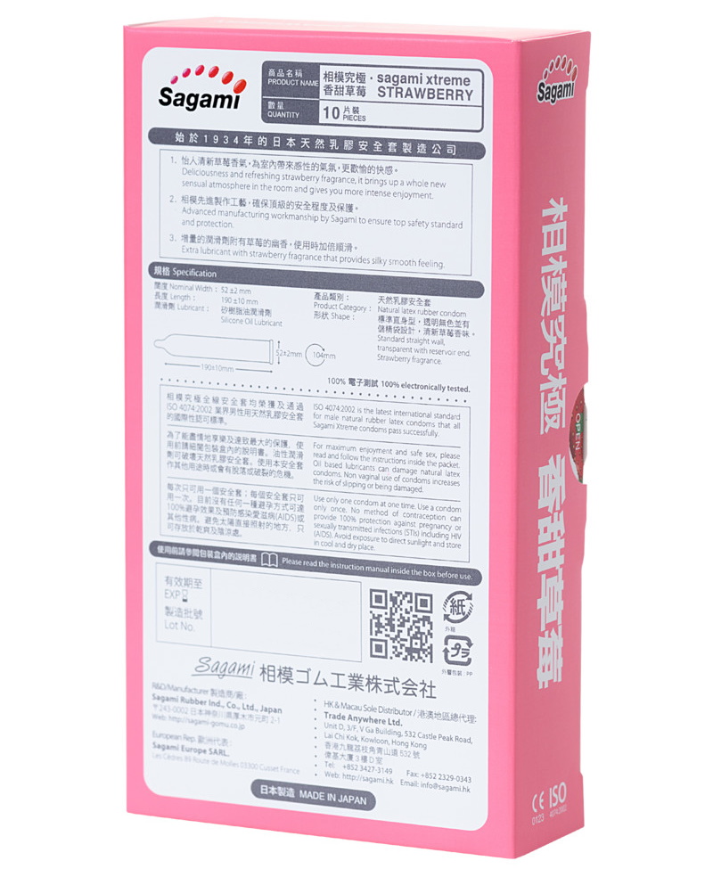 Sagami Xtreme Strawberry максимально сохраняют ощущения, а главная особенность - Вы можете использовать их в качестве оральных презервативов, ведь Xtreme Strawberry имеют приятный вкус и аромат.