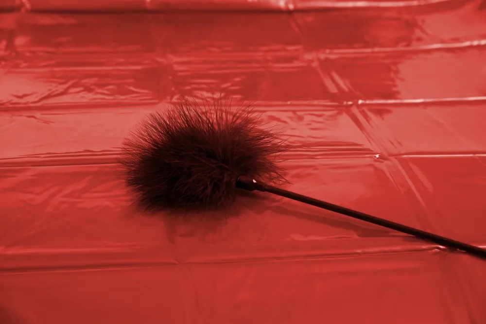 Красная лаковая простынь легко чистится и поэтому оптимально подходит для игры с маслом, шоколадом, сливками...