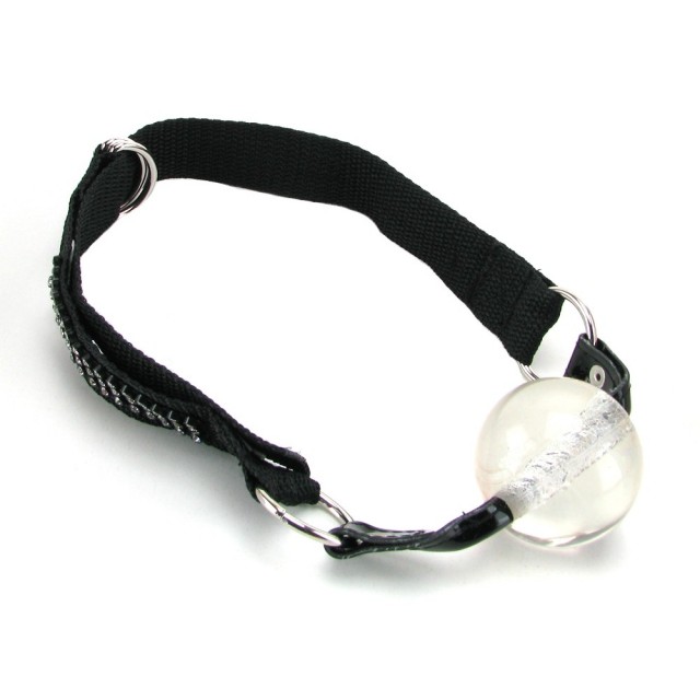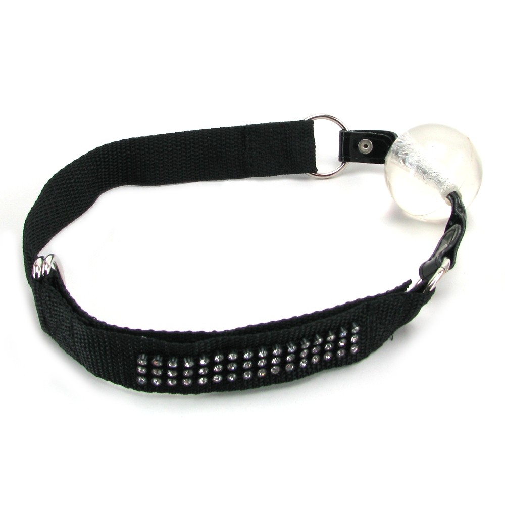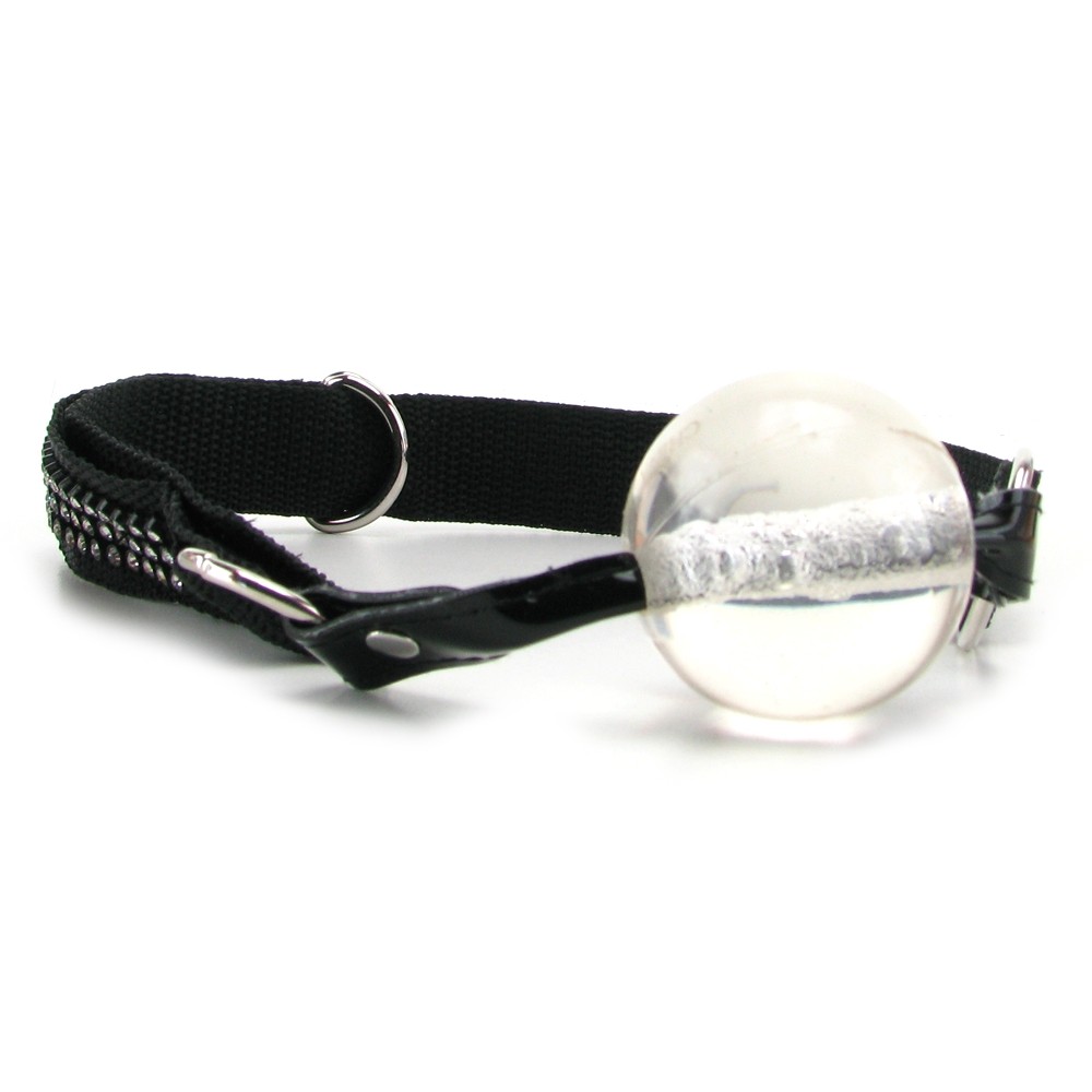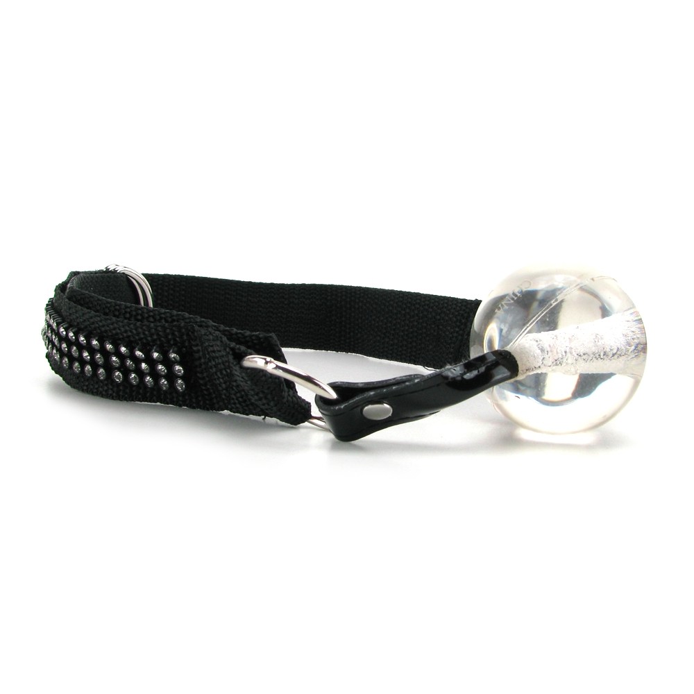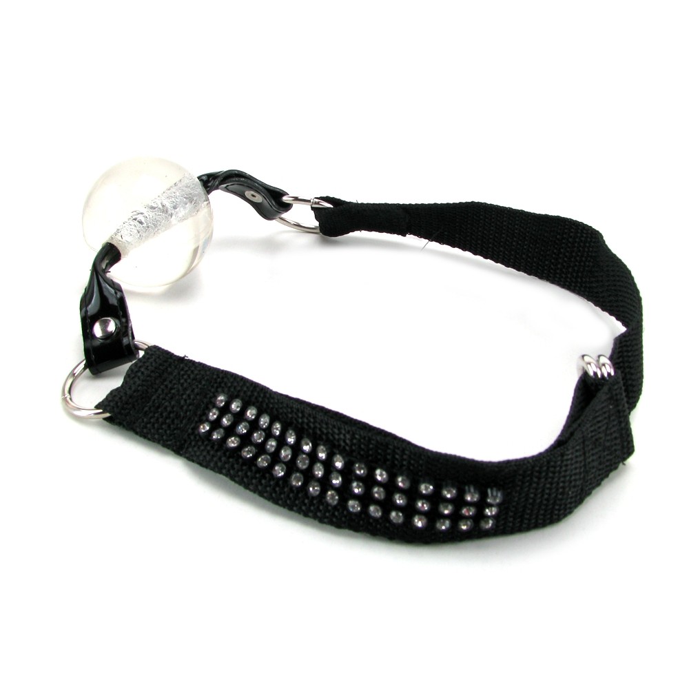 Красивый и безупречный кляп из прозрачного ПВХ на широком ремне, декорированном стразами.