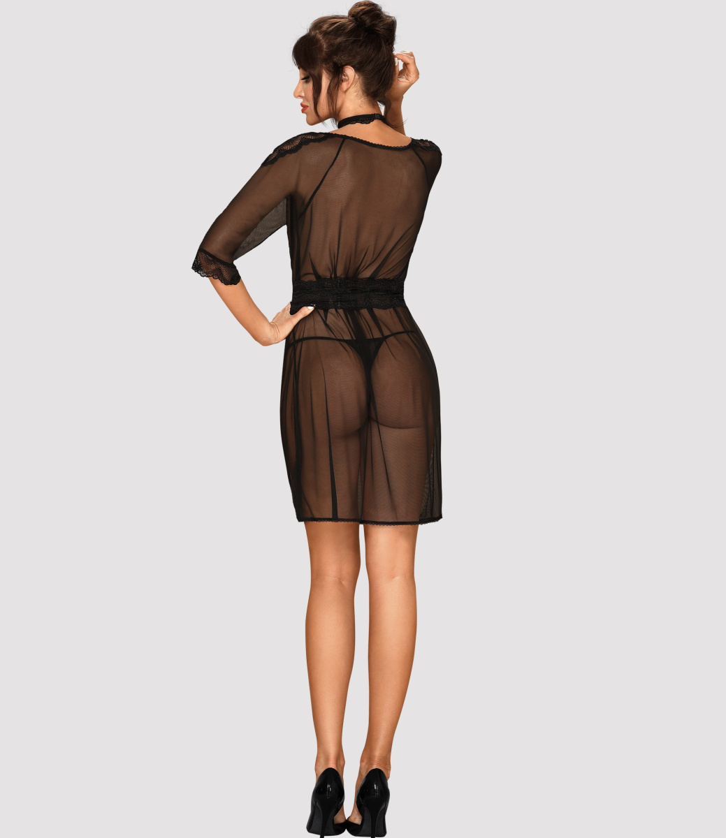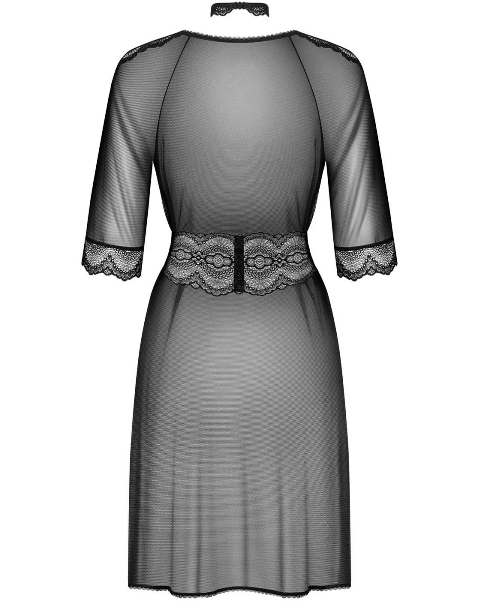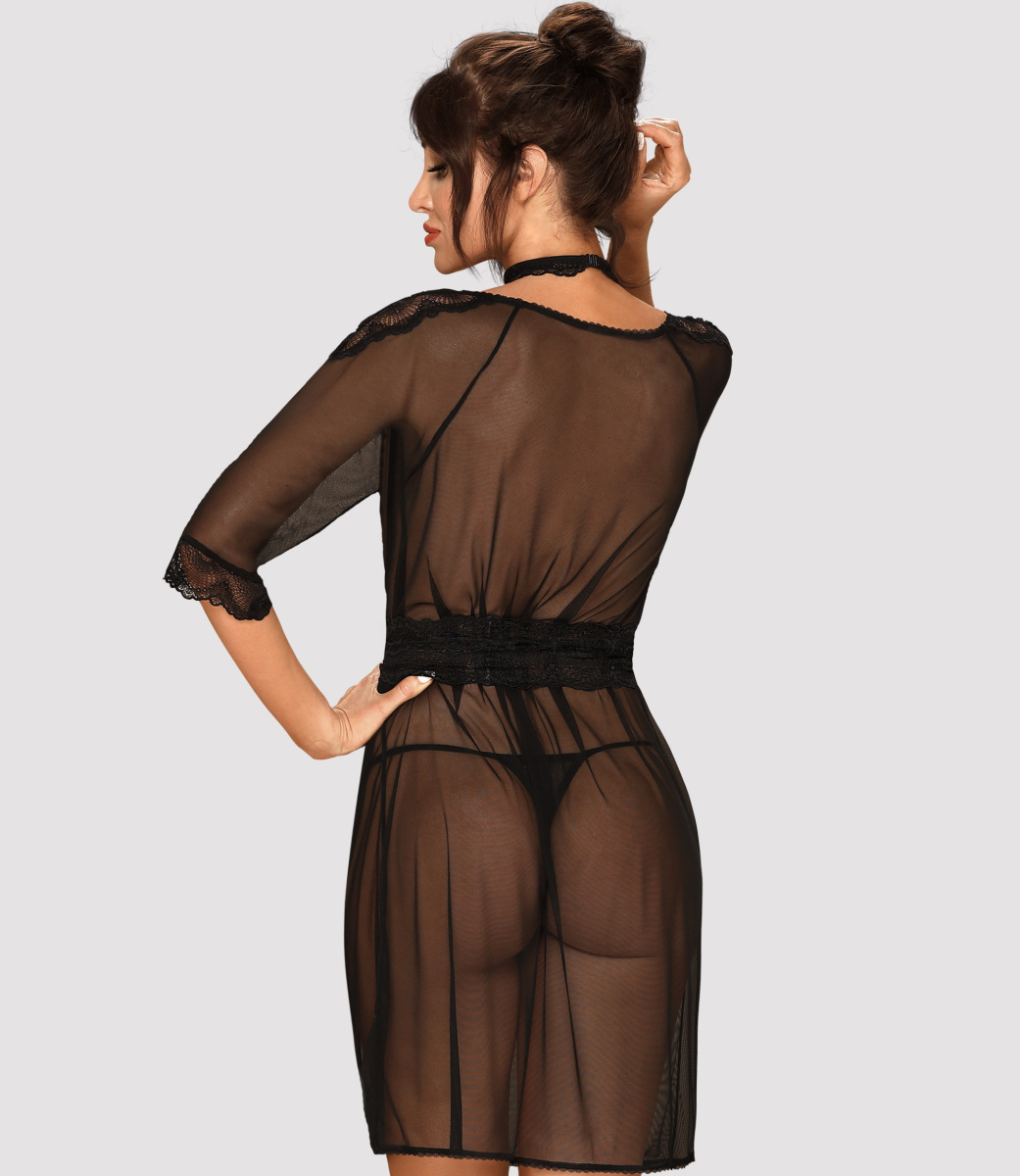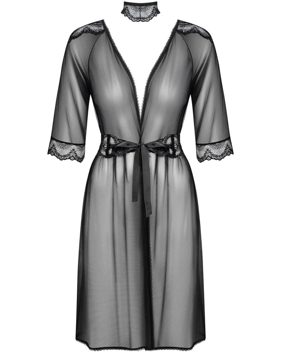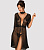 Комплект включает в себя пеньюар, чокер и кружевной пояс.