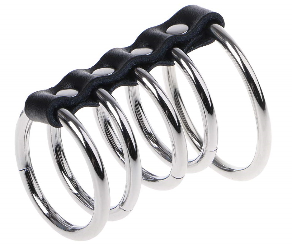 Наибольшее кольцо фиксирует мошонку и основание пениса, четыре кольца поменьше надеваются на ствол пениса.