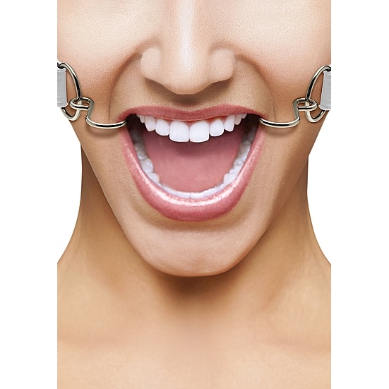 Расширяющий кляп в форме двух крюков с резиновыми наконечниками для безопасного использования. Крепится к голове при помощи кожаных ремешков (ширина - 2,5 см).