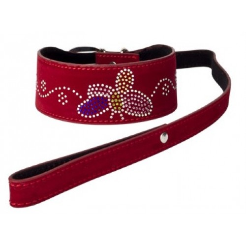 Ошейник с бархатистой поверхностью и нежным рисунком бабочки из страз регулируется по объему при помощи ремня, расположенного сзади, так же имеется поводок прикрепленный на карабин и петелька для большего удобства.