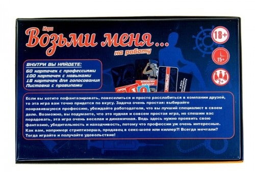 Если вы любите веселиться, фантазировать и просто расслабляться в кругу классной компании – игра «Возьми меня на работу» именно для Вас! Динамика игры, разнообразные задания и неожиданный результат не оставят вас равнодушными!