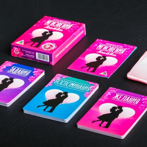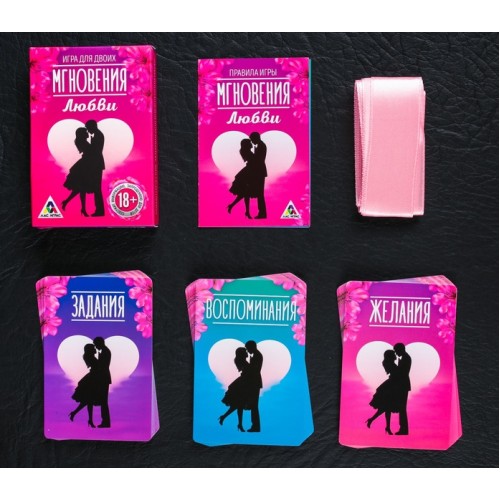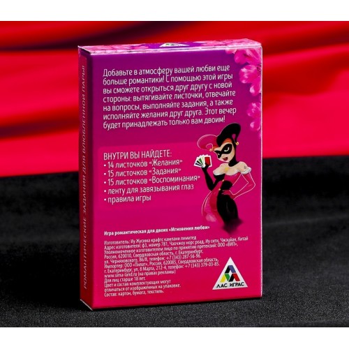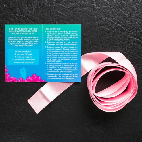 В наборе: 14 листов «Желания»; 15 листов «Задания»; 15 листов «Воспоминания»; лента для глаз; правила игры.