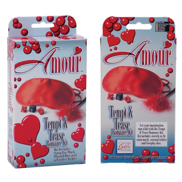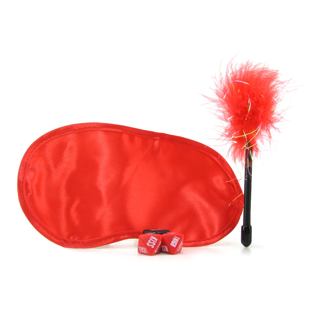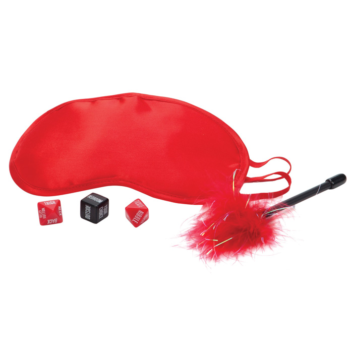 Романтичный набор красного цвета из трех игровых предметов - маски на глаза, перьевая кисточка, черный кубик и два красных бриллиантика.