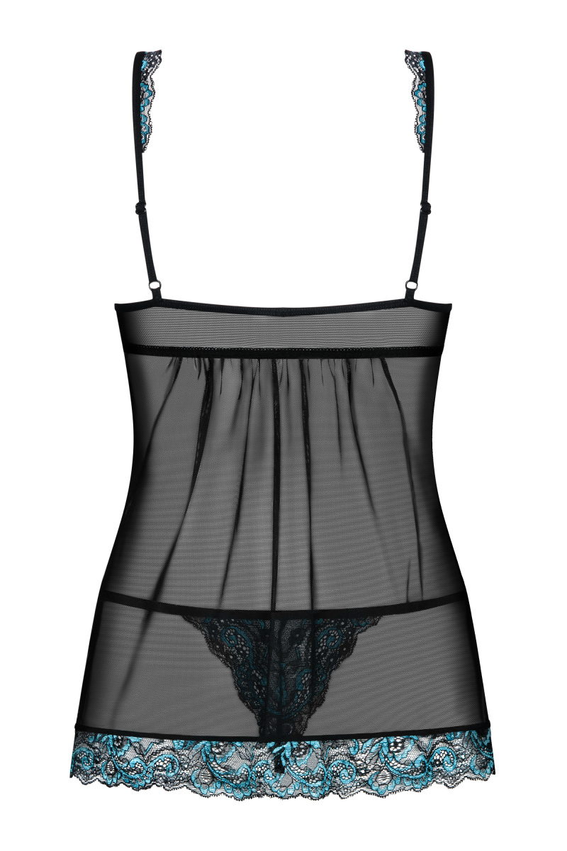 Детали: открытый животик, регулируемые лямки обеспечивают идеальную посадку, чашечки на косточках оторочены резинкой - отлично ложатся на бюст, удобная застежка и атласные ленты между чашками - легко надевать и так же легко снимать, дополнительная резинка на линии груди - идеально прилегает к телу, края сорочки украшены красивым кружевом, сексуальные, кружевные стринги в тон сорочке, воздушная, эластичная ткань.