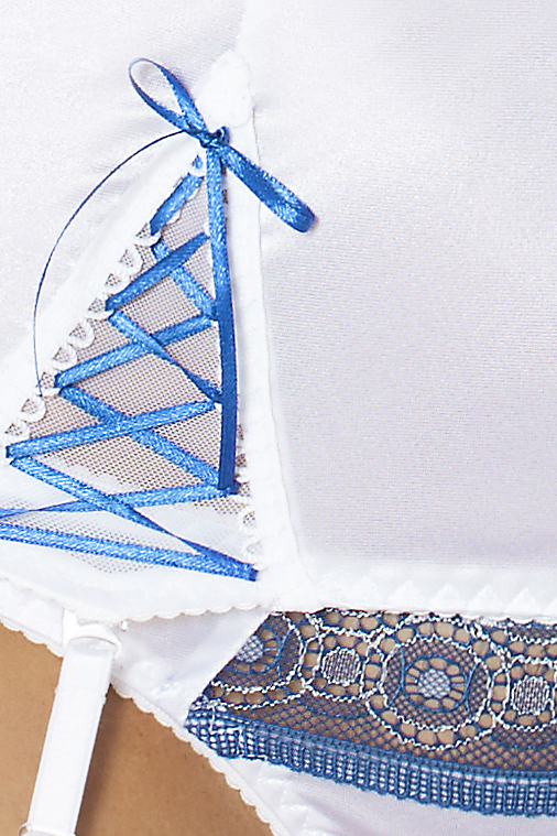 Роскошный изящный корсет Passion выполнен из тонкого полупрозрачного атласа, декорированного нежным голубым итальянским кружевом и атласными бантиками!