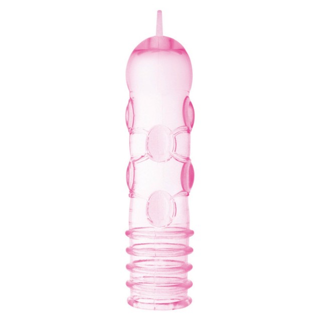 Розовая прозрачная насадка с рельефным дизайном по всей поверхности насадки с объемными ребрами и шариками. Длину насадки можно откорректировать, аккуратно подрезать ножницами, если необходимо уменьшить длину. Насадку можно использовать не только как насадку на пенис, но и для классического пластикового вибратора. Номинальная длина насадки 12,5 см.