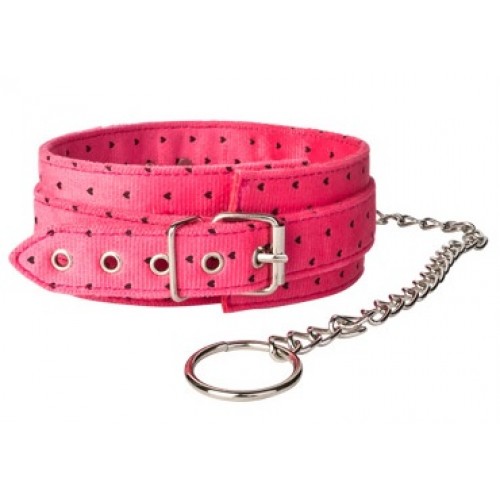 Мягкий ошейник из плюша регулируется по объему при помощи ремня на застежке, расположенного сзади, так же имеется закрепленный на карабин поводок в виде цепочки с кольцом на конце для большего удобства.