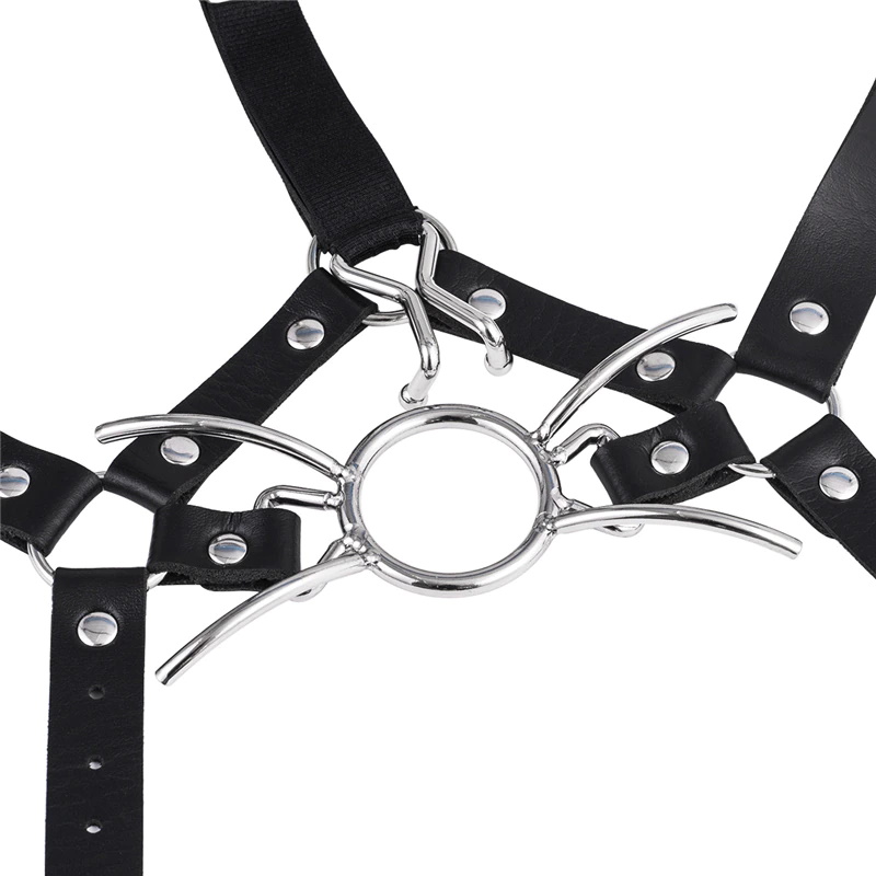 Сбруя черного цвета с металлическим кольцом-расширителем и скобами в ноздри – комфортный и необычный аксессуар для эротических игр!